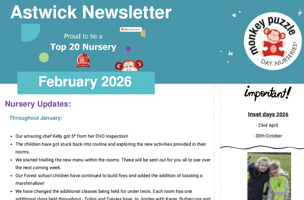 A Monkey Puzzle Day Nursery Franchise owned and operated by NJM Investments Ltd t/a Monkey Puzzle Day Nursery Astwick, registered in England and Wales, Company Number 10517821 whose registered office is 15 West Street, Brighton, BN1 2RL